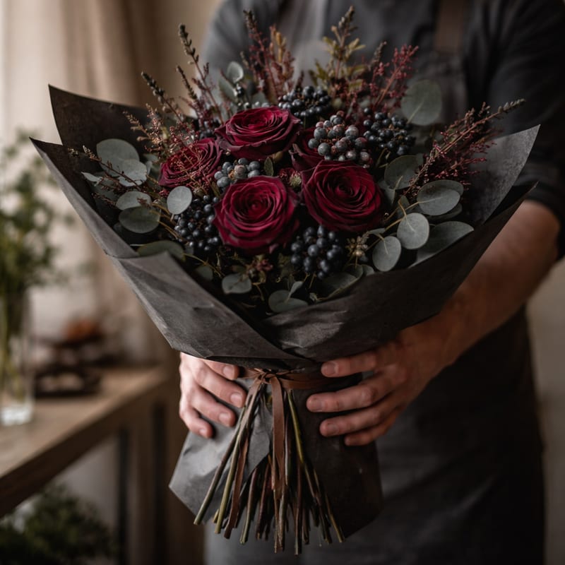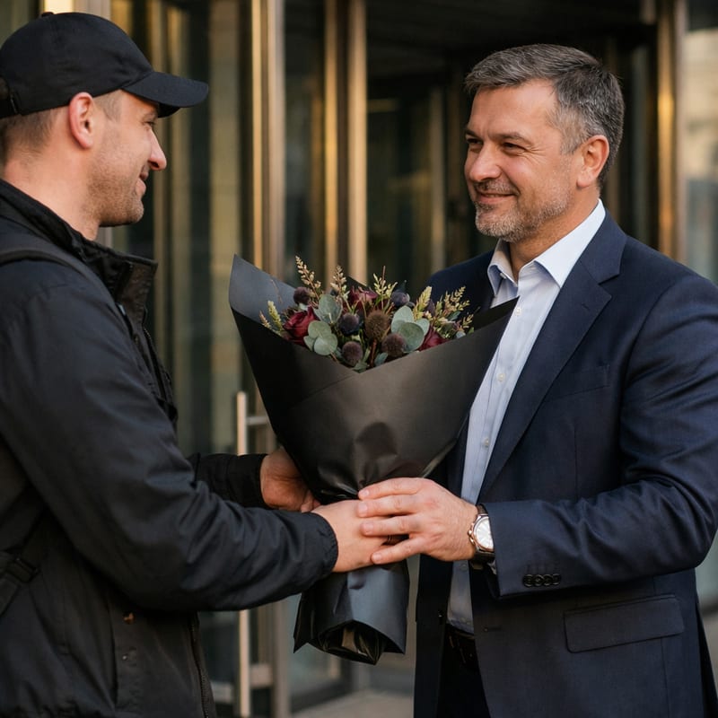 Лучшие предложения — строгие монобукеты из роз бордового, красного или чёрного цвета, гладиолусы, хризантемы, герберы, каллы. Избегайте розовых и пастельных оттенков, пионов и избыточного декора. Флорист подготовит роскошные букетики в мужской палитре без сладости и кружев.