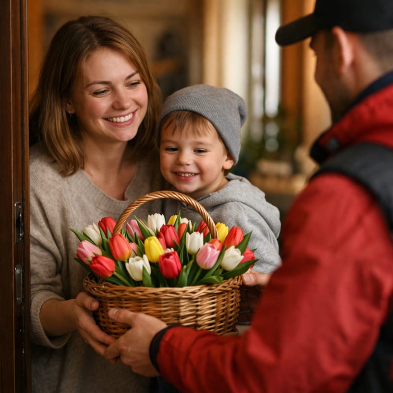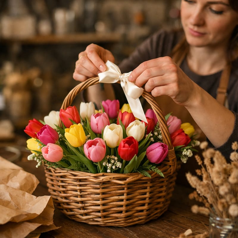Топ-3: 1) Моно-розовые 51 шт в средней плетёной корзине (4500-5500 руб.) — нежно для жены/мамы; 2) Микс пастель (белый+розовый+кремовый) 35 шт (3500-4500 руб.) — романтично; 3) Премиум 101 тюльпан в большой корзине (8500-9500 руб.) — для главной женщины. Дополните макарунами или коробкой Ferrero. См. цветы на 8 марта.