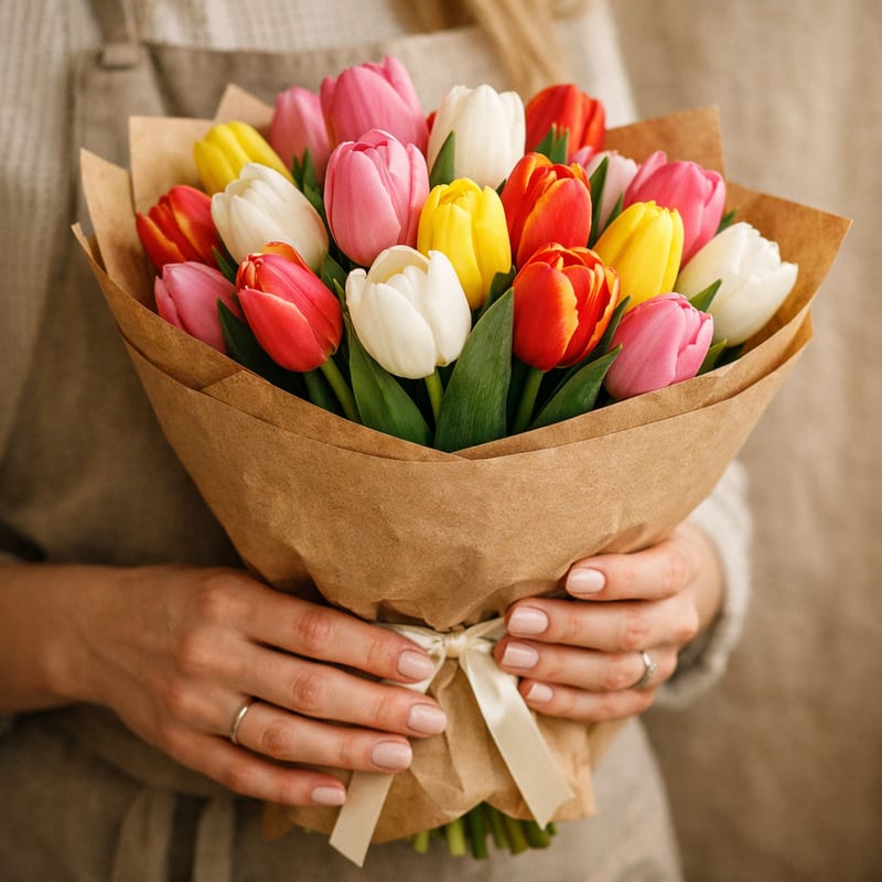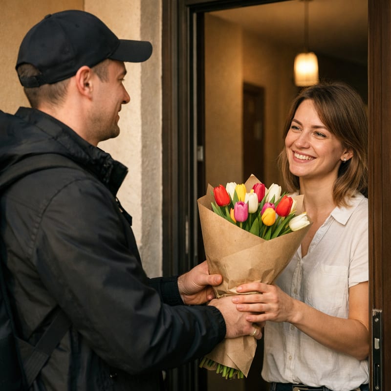 Да. Корпоративная закупка от 50 штук — скидка по запросу. Соберём одинаковые букеты для коллектива (по 5–9 тюльпанов в крафт-упаковке) или общий пышный букет на 25–51 тюльпан. Оформляйте заявку за 5–7 дней до 8 марта — пиковая загрузка курьеры. Доставка — бесплатная.