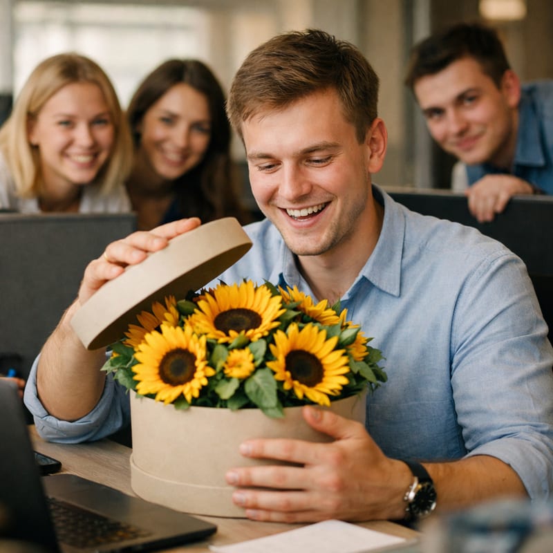 Да, подсолнух — один из лучших «мужских» цветов наряду с ирисами и хризантемами. Особенно подходит: друзьям-мужчинам, начальнику, тренеру, врачу. Цвет (жёлто-оранжевый) и форма (без «розовости») делают подарок солидным. На юбилей мужчины 50+ — премиум-композиция 9-11 подсолнухов в чёрной коробке (5500-6500 руб.). См. цветы для мужчины.
