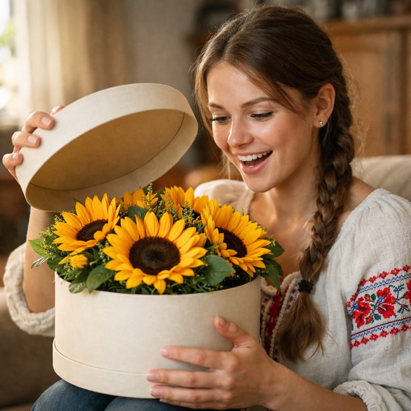Подсолнух в коробке — самый «солнечный» подарок: огромный жёлтый бутон 15–25 см с тёмной сердцевиной, символ счастья, оптимизма и тепла. Стойкость 7–10 дней, цена сравнима с герберами. Сезон — июль-октябрь (местные), круглый год — голландские. В ассортименте «МонаФлора» в Твери — готовые композиции с подсолнухами в коробке от 2649 руб.: моно ярко-жёлтые, миксы с хризантемами и герберами, осенние с зеленью. Проверенные решения для друга, мамы, на день рождения летом, осенний подарок. Доставка без оплаты от 500 руб., быстрее 90% конкурентов. См. Также букеты с подсолнухами.